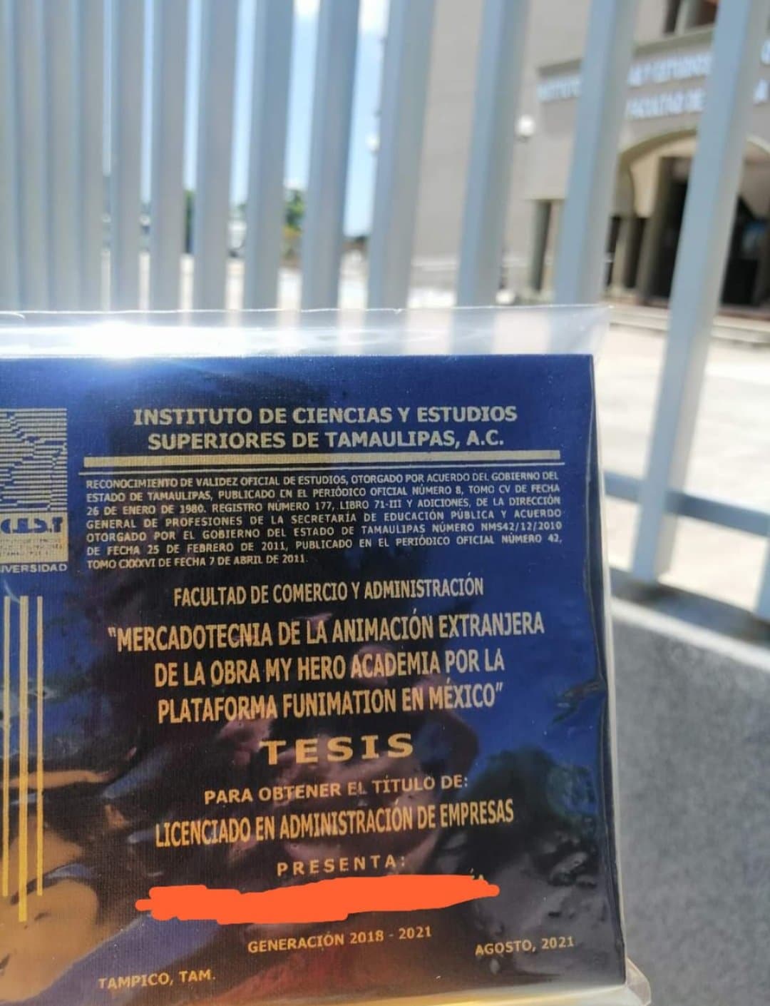 En redes sociales ha comenzado a circular una supuesta tesis de titulación realizada por un usuario no identificado en Facebook, dedicada a la distribución del anime Boku no Hero Academia (My Hero Academia) por parte de Funimation en México. La tesis es, supuestamente, para obtener el título de licenciado en administración de empresas, y se titula “Mercadotecnia de la animación extranjera de la obra My Hero Academia por la plataforma Funimation en México“. Supuestamente fue realizada por un estudiante del Instituto de Ciencias y Estudios Superiores de Tamaulipas, pero aparentemente no existe un repositorio institucional que corrobore la existencia de dicho trabajo de investigación.
