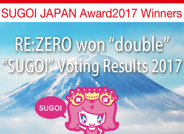 Los primeros 5 lugares han sido anunciados del concurso SUGOI JAPAN Award 2017. Es un premio de la industria que busca reconocer la excelencia en manga, anime, novelas ligeras y novelas divertidas. Y este año Re:ZERO a conseguido los primeros lugares en las categorías anime y novela ligera.